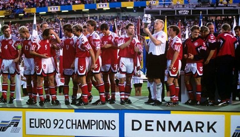 لم يكن يُتوقع من منتخب الدنمارك الكثير في بطولة عام 1992، حيث شارك بدلاً من يوغوسلافيا التي تم تعليق عضويتها في الاتحاد الأوروبي لكرة القدم بسبب الحروب في البلقان. لكن الدنمارك فاجأت الجميع بتقديم أداء مميز، حيث تصدرت مجموعتها في الدور الأول، ثم هزمت هولندا في نصف النهائي، وأخيرًا تغلبت على ألمانيا في المباراة النهائية 2-1 لترفع لقبها الأول والأخير في البطولة. 3- معجزة اليونان (2004):
