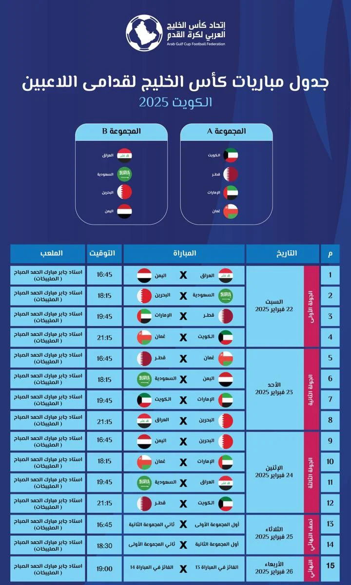 أعلن اتحاد الخليج العربي لكرة القدم عن إقامة النسخة الأولى من "كأس الخليج لقدامى اللاعبين" في الكويت، وذلك خلال الفترة من 20 إلى 24 شباط 2025. المسابقة ستشهد مشاركة ثمانية منتخبات خليجية، حيث تضم المجموعة الأولى: الكويت، قطر، الإمارات وعمان، بينما تضم المجموعة الثانية: العراق، السعودية، البحرين واليمن. يهدف هذا الحدث إلى تكريم نجوم كرة القدم السابقين وتعزيز الروابط الرياضية بين دول المنطقة.