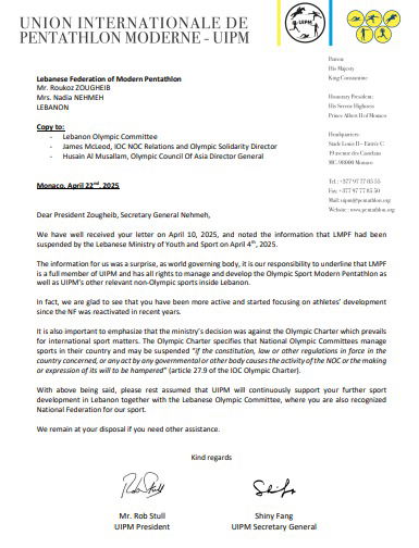 وجاء في الكتاب: "بصفتنا الهيئة الحاكمة عالمياً، نؤكد أن الاتحاد اللبناني للخماسي الحديث هو عضو كامل العضوية في الاتحاد الدولي، ويتمتع بكافة الحقوق في إدارة وتطوير رياضة الخماسي الحديث الأولمبية، بالإضافة إلى الأنشطة المرتبطة بالرياضات غير الأولمبية في لبنان".