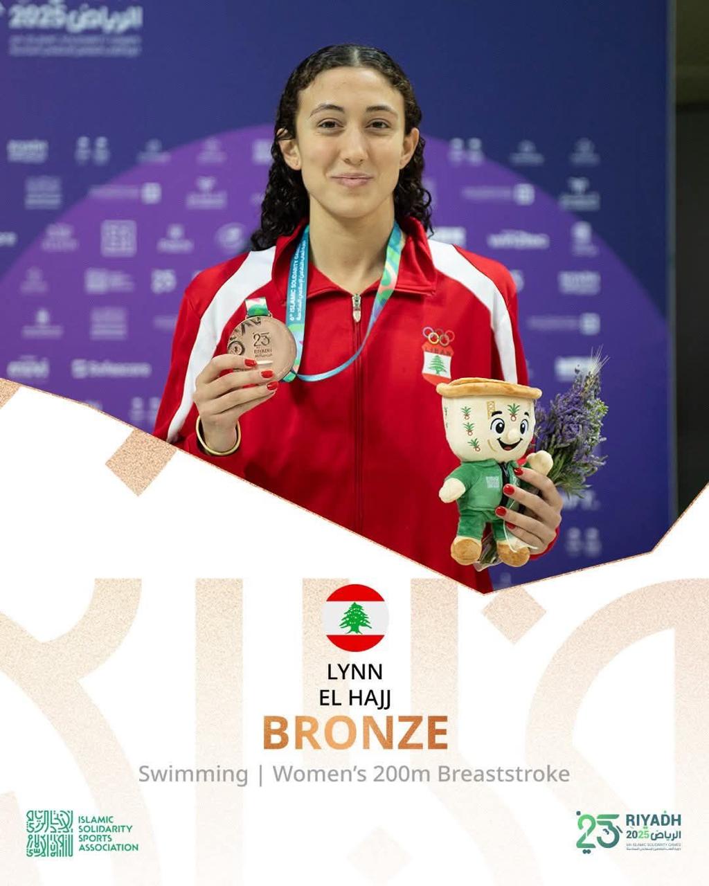 تابعت السباحة اللبنانية المتألقة لين الحاج تقديم عروضها وإنتصاراتها النوعية حيث تمكنت مساء اليوم الإثنين 10 تشرين الثاني الجاري من إحراز الميدالية البرونزية الثانية لها في دورة ألعاب التضامن الإسلامي السادسة المقامة في مدينة الرياض عاصمة المملكة العربية السعودية وذلك ضمن منافسات مسابقة السباحة لمسافة 200 متر صدر حيث حلّت في المركز الثالث في نهائي السباق بزمن بلغ 93 : 33 : 2 دقيقة بعدما كانت حلّت في التصفيات المؤهلة قبل ظهر اليوم بالمركز الأول وبزمن بلغ 97 : 42 : 2 دقيقة وهي نتيجة مشرفة للبعثة اللبنانية في هذه الدورة وللسباحة الحاج على وجه الخصوص التي إستطاعت أن تكون الورقة الرابحة لوطنها لبنان على مدى اليومين الماضيين وأدرج إسم لبنان في قائمة ترتيب ميداليات النسخة السادسة للدورة إلى جانب دول قوية ومقتدرة .