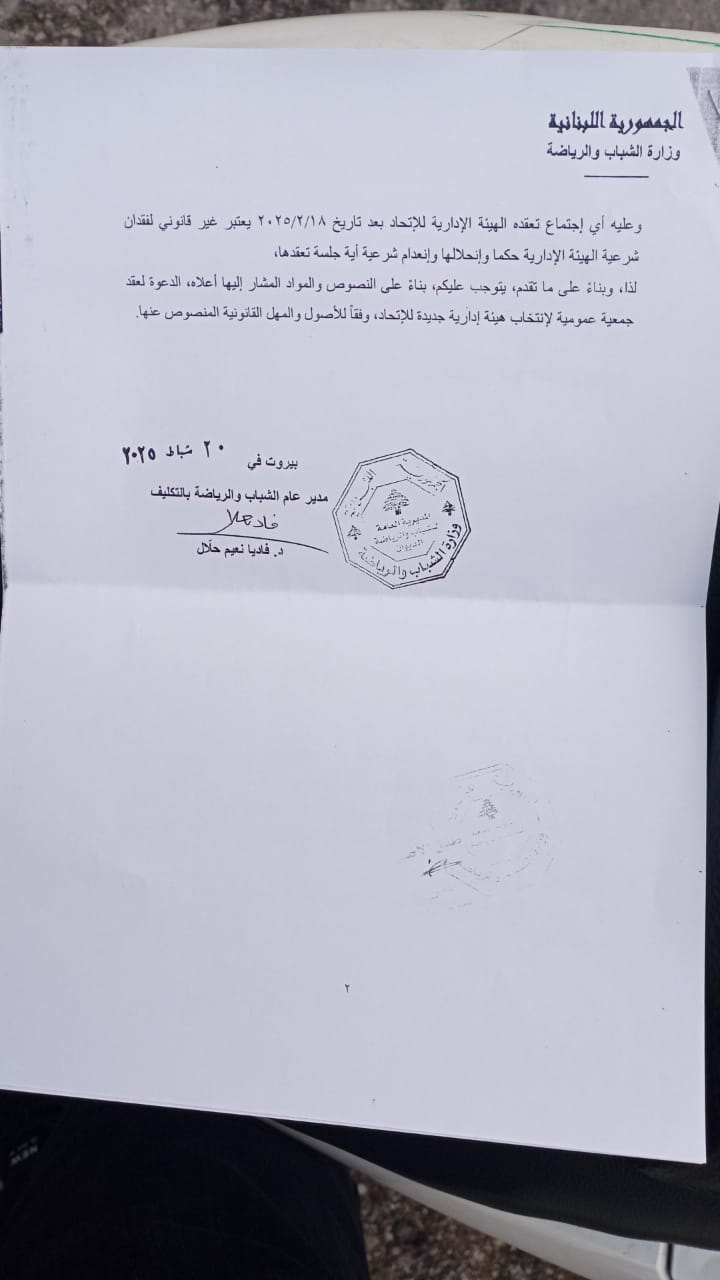 غير أنّ وزيرة الرياضة أصدرت قرارًا يناقض ما ورد في قرار المديرية العامة، مستندة إلى كتب رسمية وردت إليها من العضوين المستقيلين مروة حسين دقيق وإبراهيم الدح، مما يثير تساؤلات قانونية حول مستقبل الاتحاد وآلية اتخاذ القرارات داخل الوزارة.