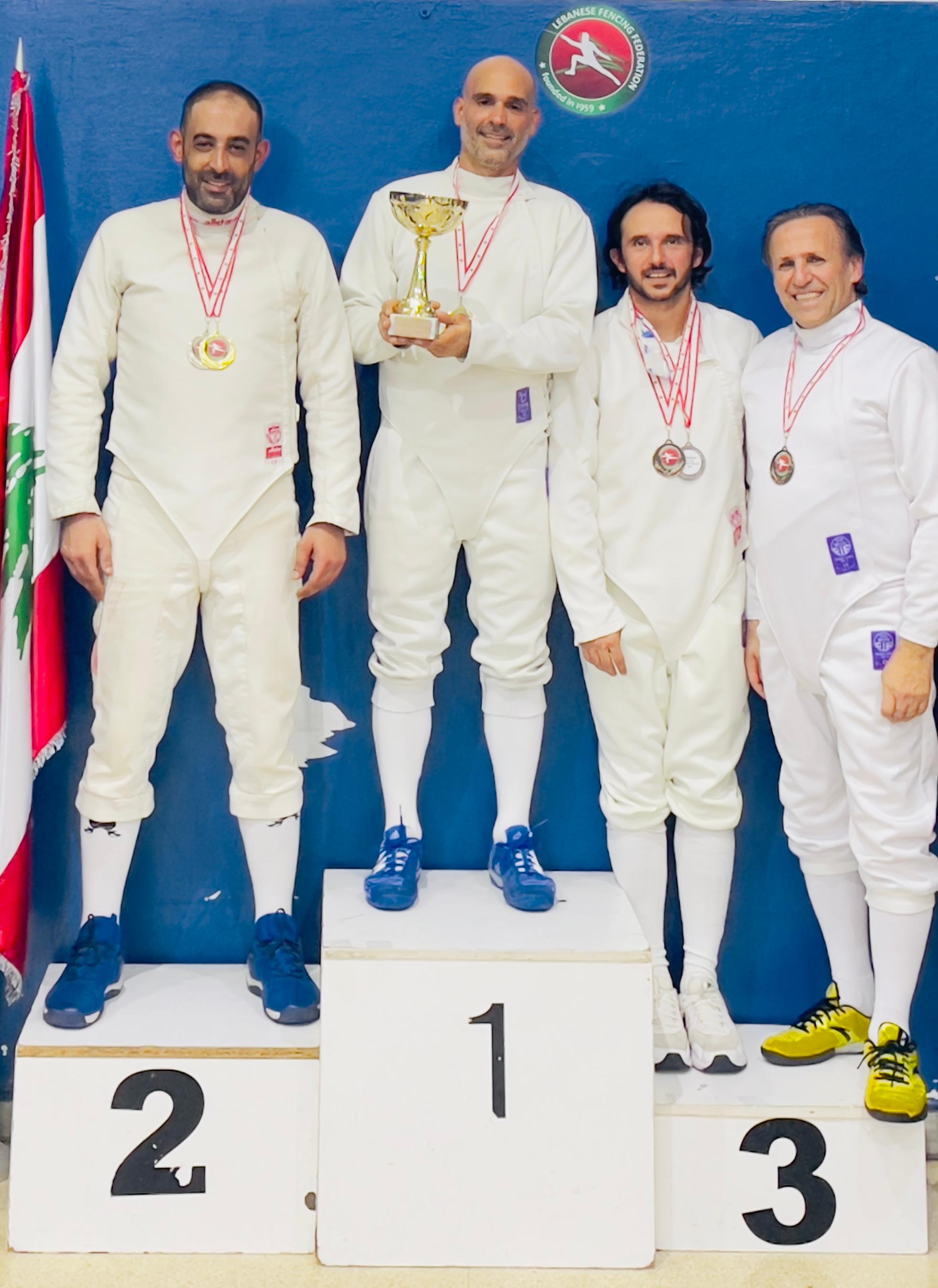 أما في فئة سلاح الشيش (ذكور 40 سنة وما فوق)، نجح محمود علي أحمد من نادي البرج عينطورة في اقتناص اللقب بفوزه في النهائي على عماد نحاس من نادي المون لاسال، بينما تقاسم روجيه طانيوس ومروان إفرام المركز الثالث.