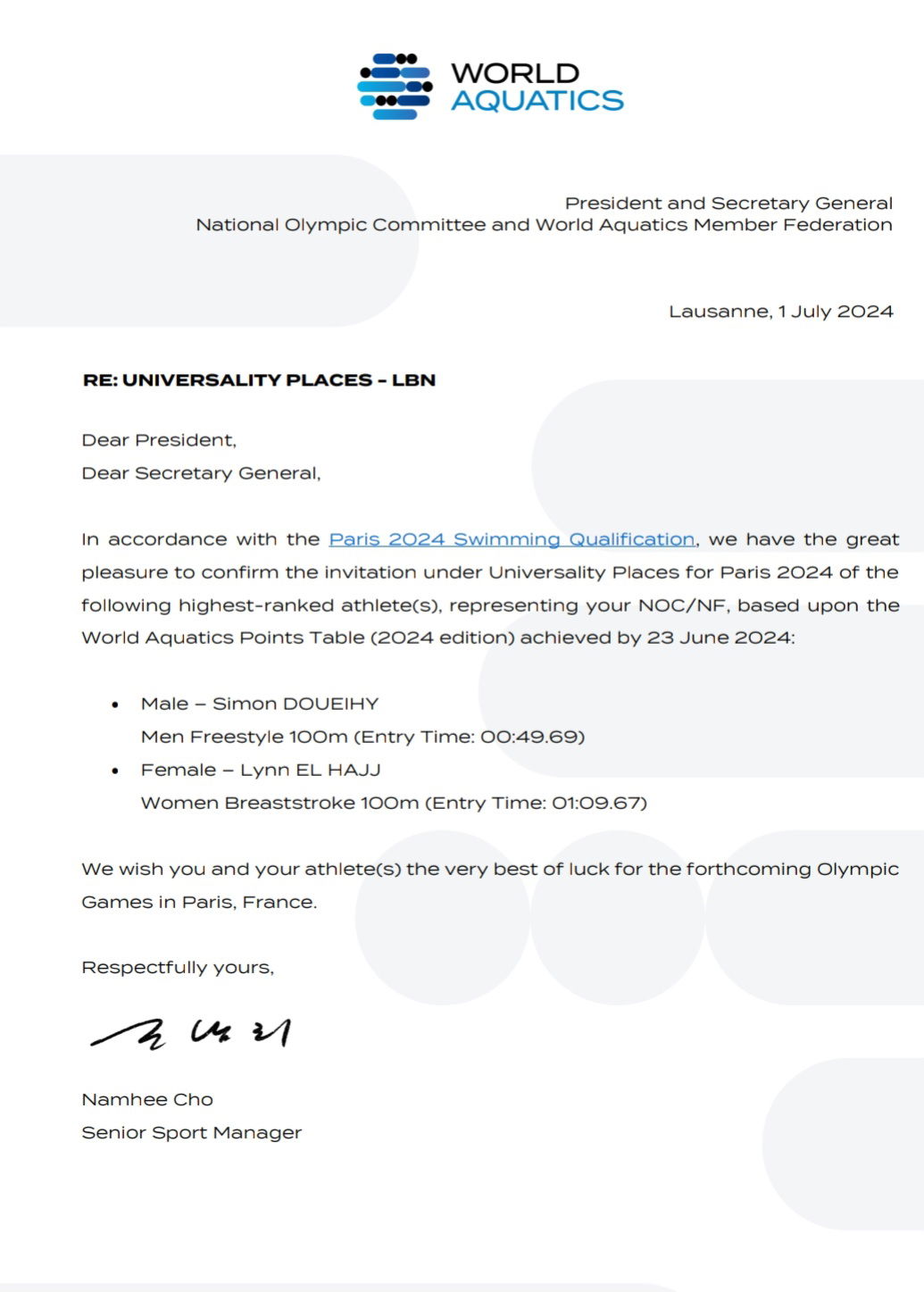 وحققت سبّاحة الجزيرة لين محمد الحاج رقماً مؤهلاً للألعاب الأولمبية في المئة متر صدراً وهو 1.07.67 دقيقة (Cut B). وهنا الأرقام التي سجلتها لين الحاج في الخارج وكلها في سباحة الصدر: