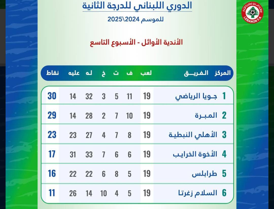 قبل انتهاء منافسات بطولة لبنان لكرة القدم لسداسية الاوائل للدرجة الثانية بمرحلة واحدة استطاع ناديي المبرة والرياضي جويا الصعود الى دوري الاضواء،وعودة المبرة جاءت بعد غياب دائم اكثر من 23 سنة عن الدرجة الممتازة في حين حقق الرياضي جويا انجازا تاريخيا ليكون الموسم المقبل بين الاندية الممتازة.وفي وقائع المباراتين فقد تغلب المبرة على الاهلي النبطية (4-2) اللقاء اجري الاحد على ملعب نادي العهد سجل للفائز السنغالي بابا سيسيه "سوبر هاتريك" في الدقائق (24،56،68،و90) وللخاسر الايفواري كريس نوتا في الدقيقتين ( 10 من ضربة جزاء و51).وفي المباراة الثانية التي احتضنها ملعب انصار في الجنوب فاز جويا على الاخوة الخرايب (3-0) سجل الاهداف كل من محمد جواد (67) والسنغالي ادرامي ديالو (85) وحسن قضماني (92).وبهذه النتيجتين تصدر الرياضي جويا الترتيب العام برصيد 30 نقطة فيما حل المبرة ثانيا ب29 نقطة..