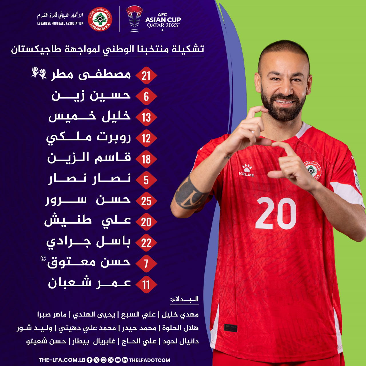 ودّع منتخب لبنان نهائيات كأس آسيا لكرة القدم، بعد خسارته أمام طاجيكستان (١ - ٢) في المباراة التي جمعتهما على ملعب جاسم بن حمد أمام أكثر من ١٠ آلاف متفرجاً أغلبهم من الجالية اللبنانية، تقدم لبنان بواسطة باسل جرادي (د.٤٧)، لكن طرد المدافع قاسم الزين بدّل المعطيات بسبب خطأ متهوّر (د.٥٦). ردّت طاجيكستان بهدفين عبر بارفيزدزون عمرباييف (د.٨٠) ونور الدين خامروكولوف (د.٩٠+٢).
