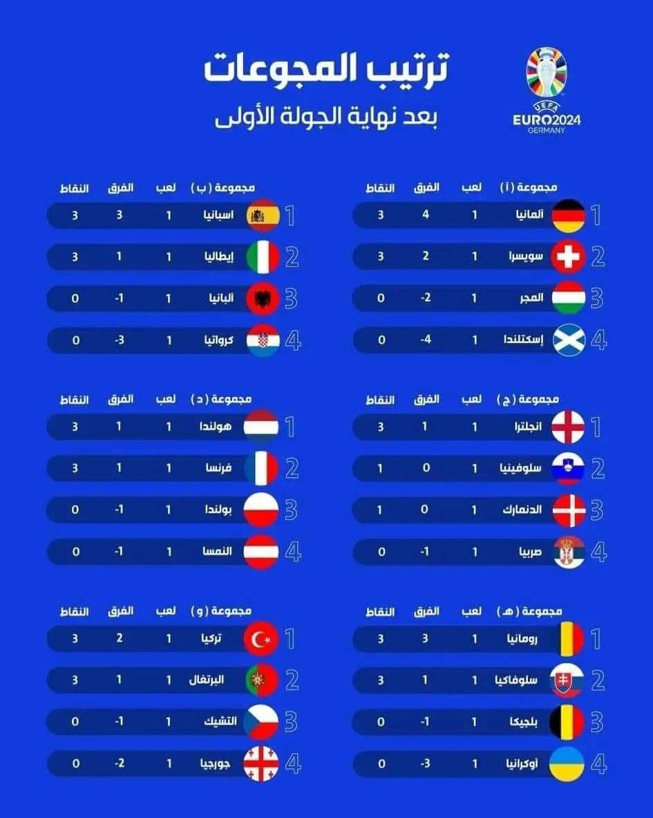 أسدل الستار عن الجولة الأولى من دور المجموعات لبطولة كأس الأمم الأوروبية 2024 المقامة في ألمانيا. البداية مع المنتخب صاحب الأرض، الذي استضاف منتخب إسكتلندا وانتهت هذه المباراة بنتيجة 5-1، للمانشافت.