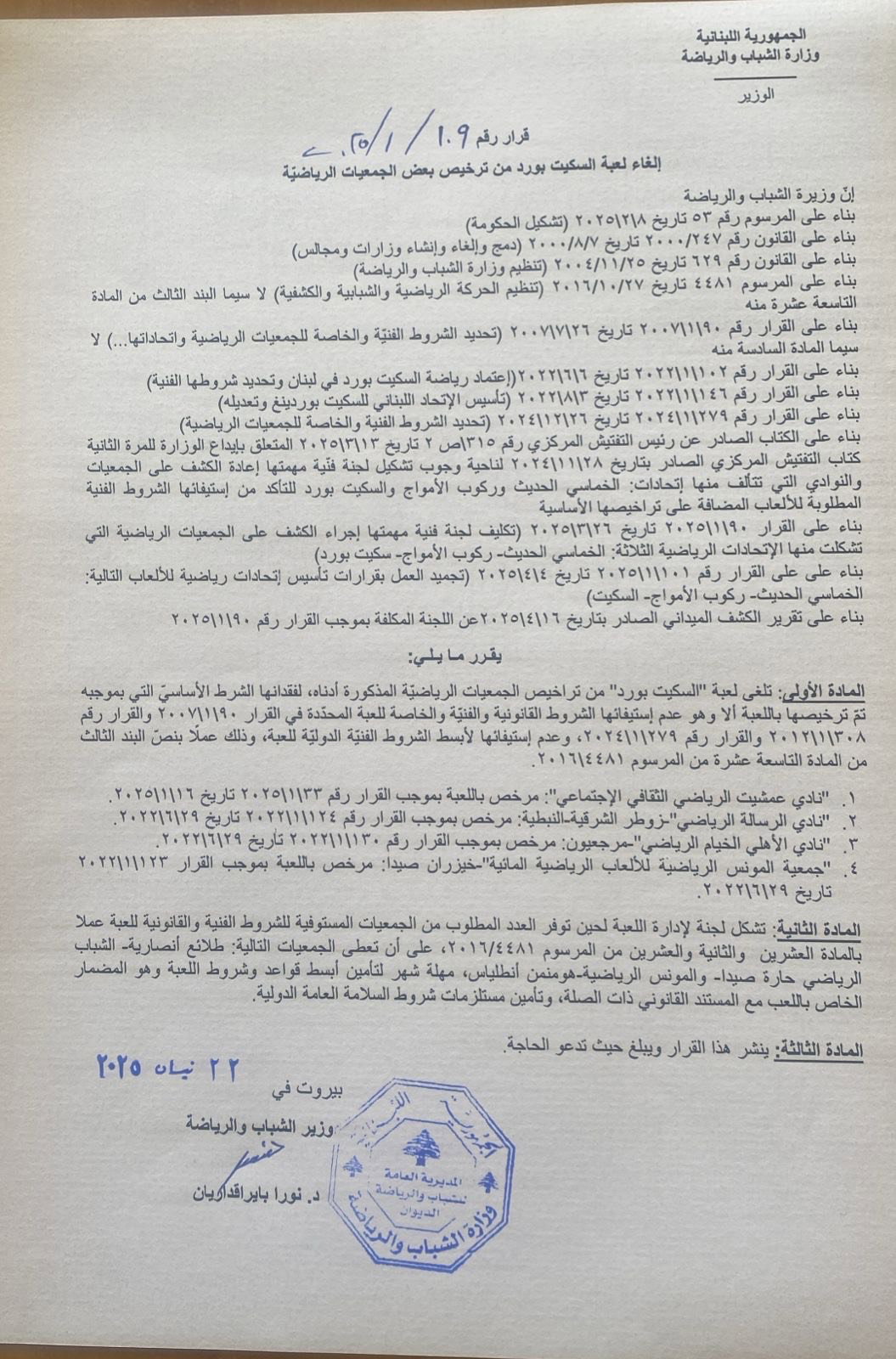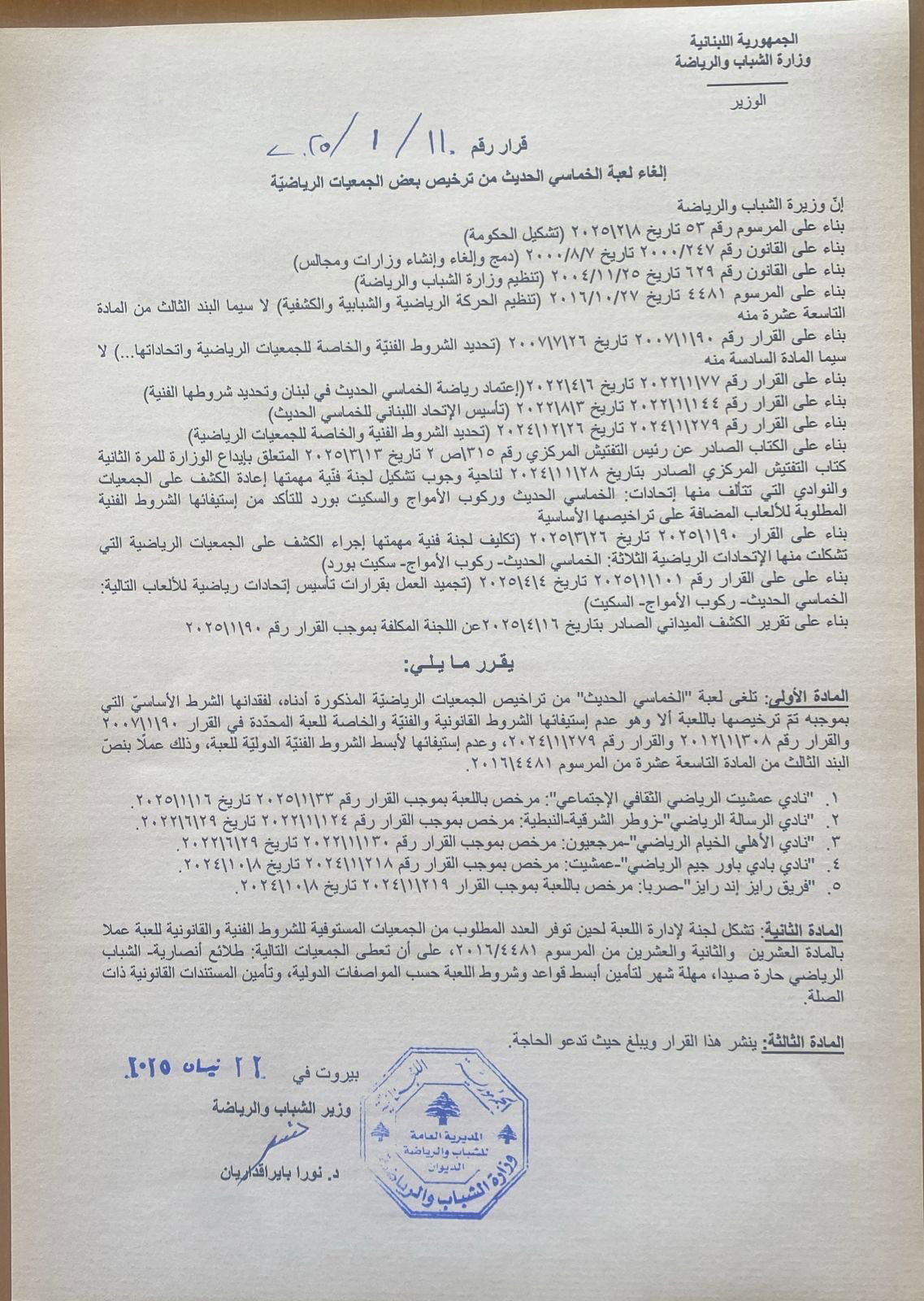 أعلنت وزيرة الشباب والرياضة اللبنانية، الدكتورة نورا بيراقداريان، عن إلغاء ثلاث ألعاب رياضية من تراخيص الجمعيات الرياضية، وهي "السكيت بورد"، "الخماسي الحديث" و"ركوب الموج"، وذلك وفقاً لما جاء في بيان رسمي صادر عن أمين عام اللجنة الأولمبية اللبنانية، الأستاذ جودت شاكر.