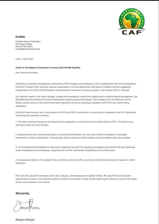 - فتح تحقيق رسمي مع عدد من اللاعبين الكينيين والكاميرونيين، بمن فيهم ماتاسي، بشأن التورط المحتمل في التلاعب. وفي حال ثبوت الإدانة، ستُفرض عقوبات صارمة، قد تصل إلى الحظر مدى الحياة من ممارسة كرة القدم.