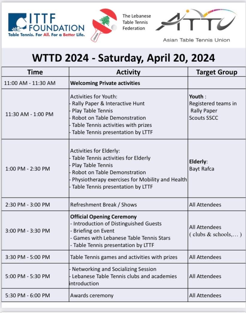 ينظّم الاتحاد اللبناني لكرة الطاولة "يوم كرة الطاولة العالمي"، السبت الواقع فيه 20 نيسان الجاري في "ليبانيز دياسبورا فيلادج" ( Lebanese Diaspora Village) بالبترون، تحت إشراف الاتحاد الدولي للعبة وبالتعاون مع الاتحاد الآسيوي، وسبق للإتحاد الدولي ان اختار هذا التاريخ لإقامة هذا الحدث في جميع أنحاء دول العالم. كما جرى إختيار لبنان ليكون عاصمة كرة الطاولة في القارة الآسيوية لما تمثله هذه اللعبة من أهمية وإنتشار. وسبق للإتحاد اللبناني أن استضاف مرات عدة هذا اليوم العالمي خلال سنوات ماضية في بيروت ولكن هذه المرة جرى إختيار مدينة البترون الساحلية الشمالية لتستضيف هذا الحدث في "نسخة" عام 2024.وفي هذا الاطار، يواصل الاتحاد اللبناني تحضيراته لإقامة هذا اليوم الرياضي الطويل على ان تنطلق النشاطات الساعة الحادية عشرة من قبل ظهر السبت المقبل وتستمر حتى الساعة السادسة مساء على ان يقام حفل الافتتاح الرسمي عند الساعة الثالثة بعد الظهر. وسيتخلل هذا اليوم مسابقات عدة بمشاركة لاعبين ولاعبات من جميع الفئات العمرية إضافة الى نجوم ونجمات اللعبة في لبنان.هذا، ودعا  الاتحاد اللبناني الى أوسع مشاركة، ليكون هذا الحدث الرياضي دلالة على مكانة لبنان على روزنامة الإتحاد الدولي للعبة، وهو بالرغم من الأوضاع  الاقتصادية الصعبة التي يعيشها وطن الأرز والمنطقة، فهو قادر على إخراج هذا الين العالمي بأبهى صورة.