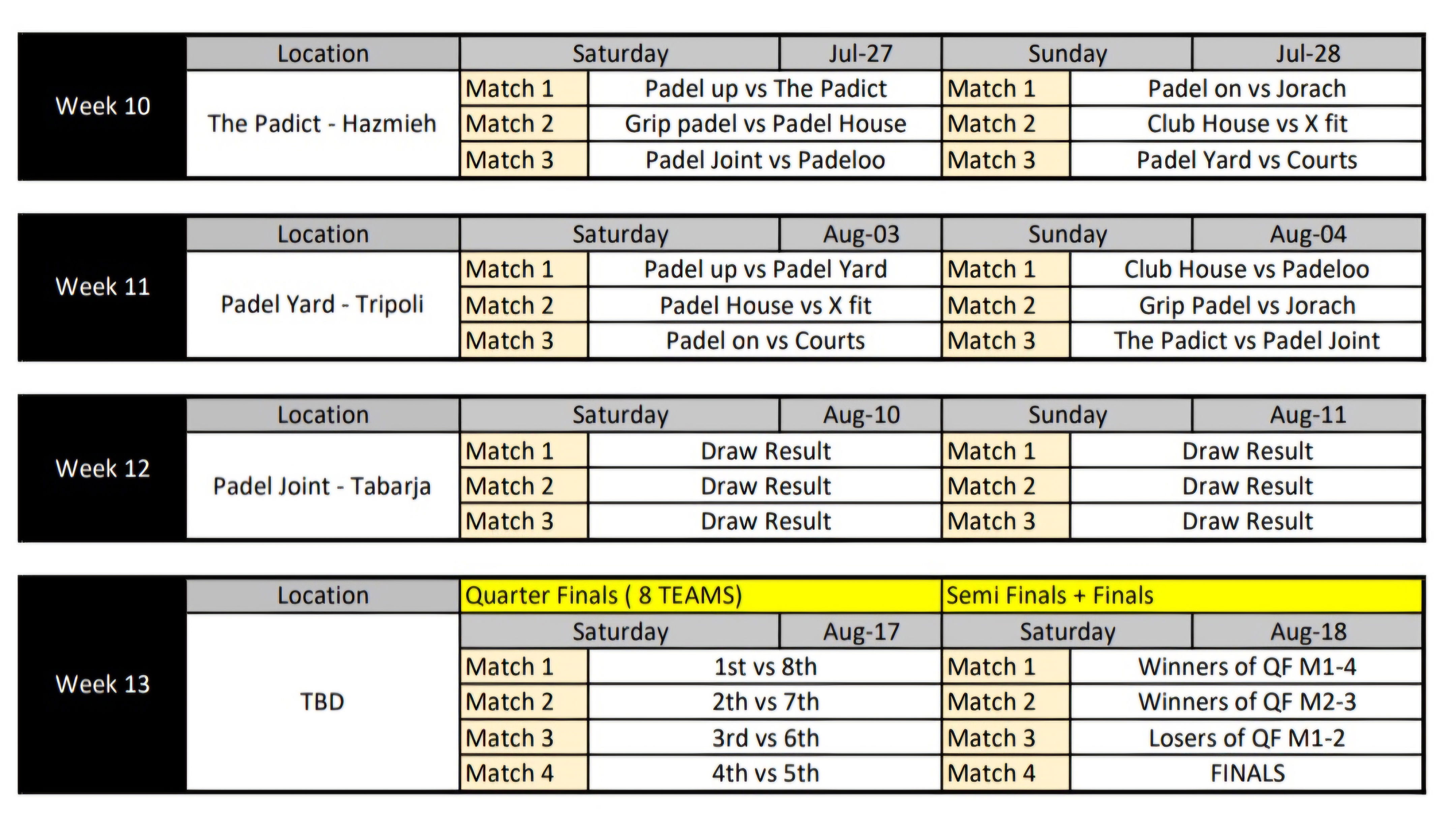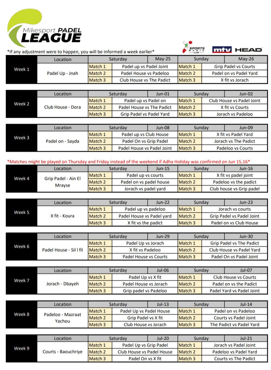 ينطلق نهاية هذا الأسبوع دوري مايك سبور للبادل، الذي سبق وأُعلن عنه في مؤتمر صحافي حاشد، بمشاركة 12 ناديًا يمثلون كافة المناطق اللبنانية. حيث تلعب كل الفرق أسبوعيًا مبارياتها حسب الرزنامة (صورة عنها) التي وضعتها اللجنة المنظمة. وهذه المباريات ستتوزع على 12 اسبوعًا. بعدها تتأهل ثمانية فرق لتخوض مرحلة البلاي أوف (دور ربع النهائي، نصف النهائي والنهائي). وستخصص جوائز مالية للفرق التي تحتل المراكز الثلاثة الأولى، اضافةً الى تأمين معسكرٍ في اسبانيا للفريق الفائز باللقب.