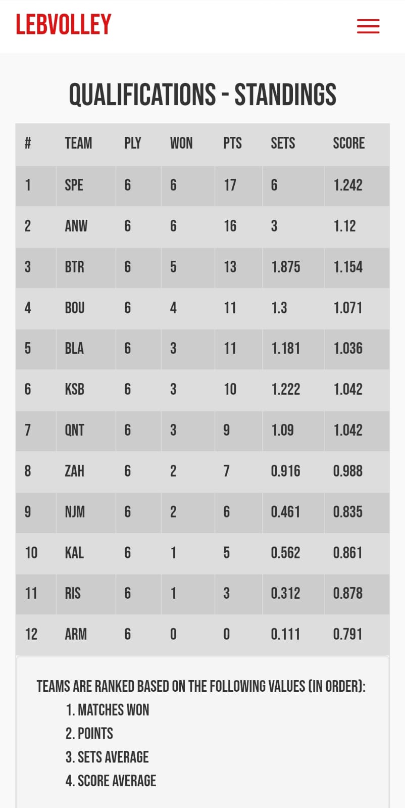استمر سبيدبول شكا في صدارة بطولة لبنان للكرة الطائرة من دون خسارة في ختام المرحلة السادسة بعد فوزه السهل على المشعل كوسبا (3-0) اللقاء اجري على ملعب البترون وجاءت الاشواط على الشكل التالي:(31-29)،(25-23)،(25-21) قاد المباراة الخكمان الياس وهبه (اول) وربيع الحاج يوسف (ثاني) كذلك الانوار الجديدة بطل لبنان بقي سجله ا خاليا من اي خسارة وتغلب على الزهراء الميناء (3-1) في المباراة التي جرت على ملعب الخاسر في الميناء، وجاءت الاشواط على الشكل التالي : (25-22-)،(25-20)،(14-25)،(26-24). قاد المباراة الحكمان بسام الجميل (اول) وبيار الجميل (ثاني.). وحقق الشباب البترون فوزه الخامس على ملعب نورث هافن على حساب الرياضي القلمون (3-2) وجاءت الاشواط على الشكل التالي،(25-12)،(25-27)،(25-18)،(17-25)،(15-10).قاد المباراة الحكمان حنا الزيلع (اول) ومحمد ياسين (ثاني). وعلى ملعب مجمع ميشال المر لاقى الشبيبة البوشرية صعوبة في تخطي الانعاش قنات وتغلب عليه (3-2)، وجاءت الاشواط على الشكل التالي: (23-25)،(26-28)،(25-19)،(25-11)،(15-11). قاد المبراة الحكمان مصطفى جراد (اول)، وعبدالله الغوش (ثاني).