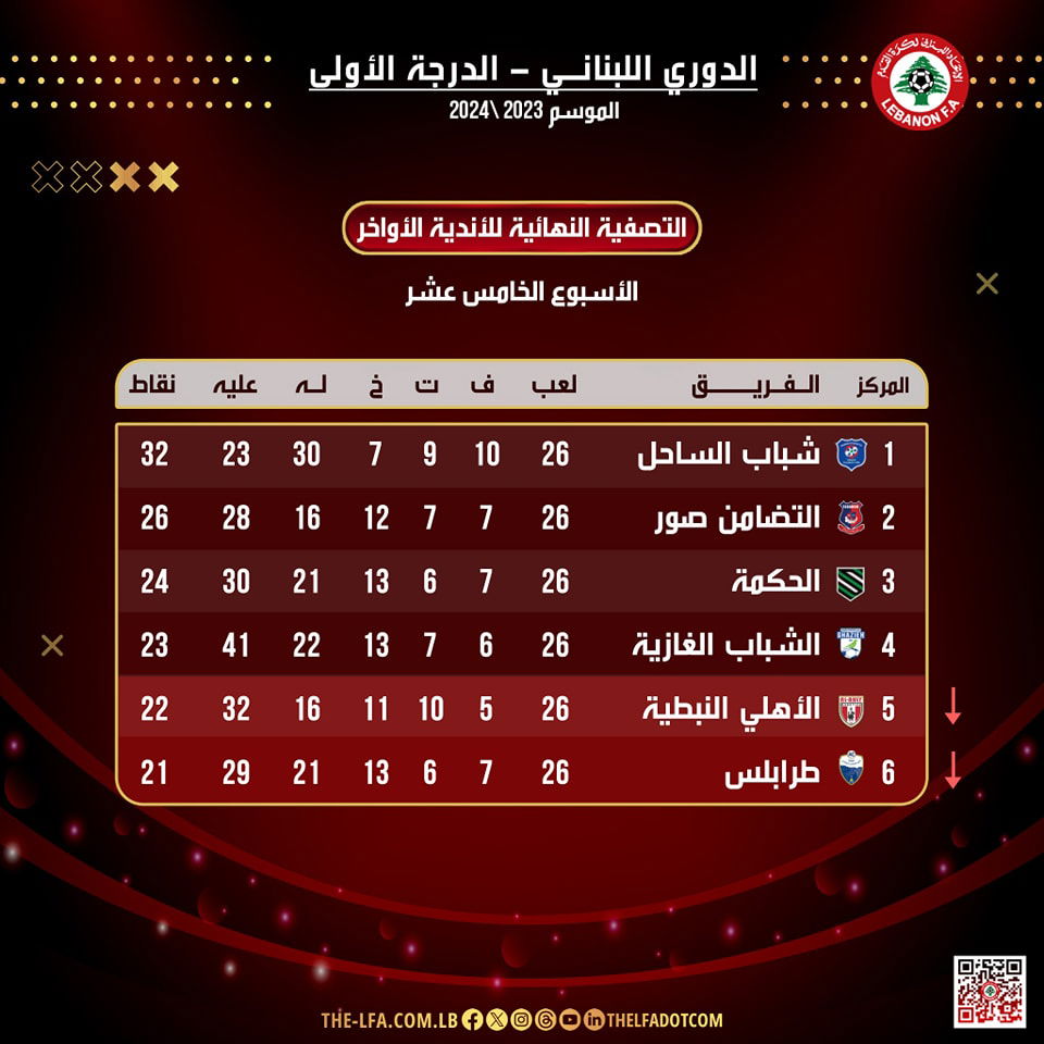 سقط فريقا طرابلس الرياضي والاهلي النبطية الى مصاف اندية الدرجة الثانية في ختام المرحلة الاخيرة لبطولة لبنان لكرة القدم لسداسية الاواخر ... مباراة الحكمة والاهلي النبطية والتي اجريت على ملعب العهد انتهت لمصلحة الاخضر (1-0) بهدف من توقيع علي حوراني في الدقيقة 56 بعد تمريرة عرضية من زميله عدنان ملحم، وقد قدم الفريقان مباراة متوسطة المستوى واستطاع الحكمة الهروب من السقوط الى الدرجة الثانية بعد ان اغلق منطقته بأحكام رغم الهجمات المتواصلة للفريق الجنوبي الا ان تسرع لاعبيه منعهم من تحقيق اهدافهم علما ان التعادل كان سيبقي النبطية في دوري الاضواء. وعلى ملعب الصفاء تعادل الشباب الغازية مع طرابلس الرياضي من دون اهداف شهد الشوط الاول سيطرت شمالية لكن من دون فاعلية بينما تسيد ابناء المدرب فؤاد ليلا الساحة واهدر لاعبوه ثلاث فرص حقيقة تكفل في صدها الحارس احمد قرحاني... وبهذه النتيجتين يسدل الستار عن سداسية الاواخر...