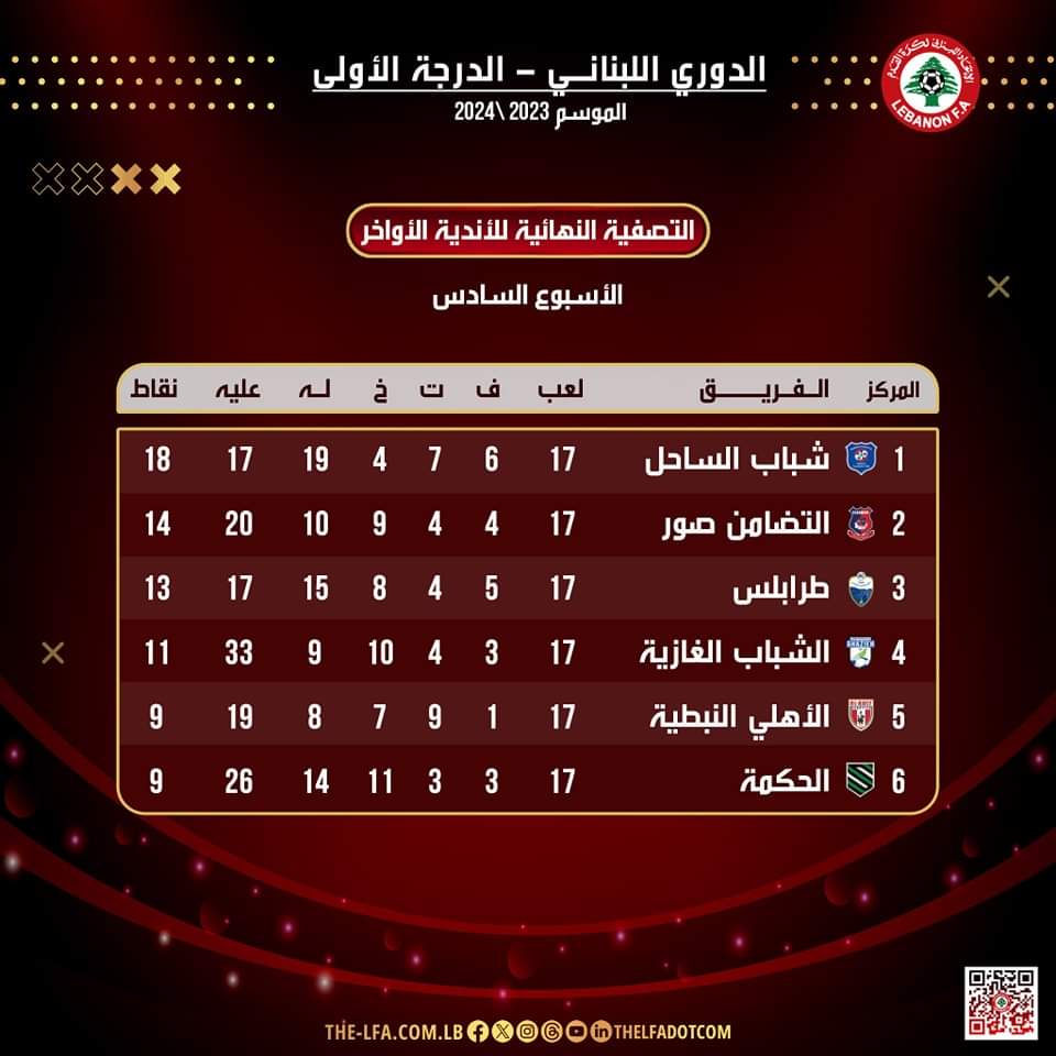 اختتمت المرحلة السادسة لسداسية الآواخر لبطولة لبنان لكرة القدم بتعادل شباب الساحل والشباب الغازية من دون اهداف، على الرغم من المحاولات الجادة من كلا الفريقين للتسجيل، هذه النتيجة رفعت رصيد الساحل الى 17 نقطة والشباب الغازية الى 11.